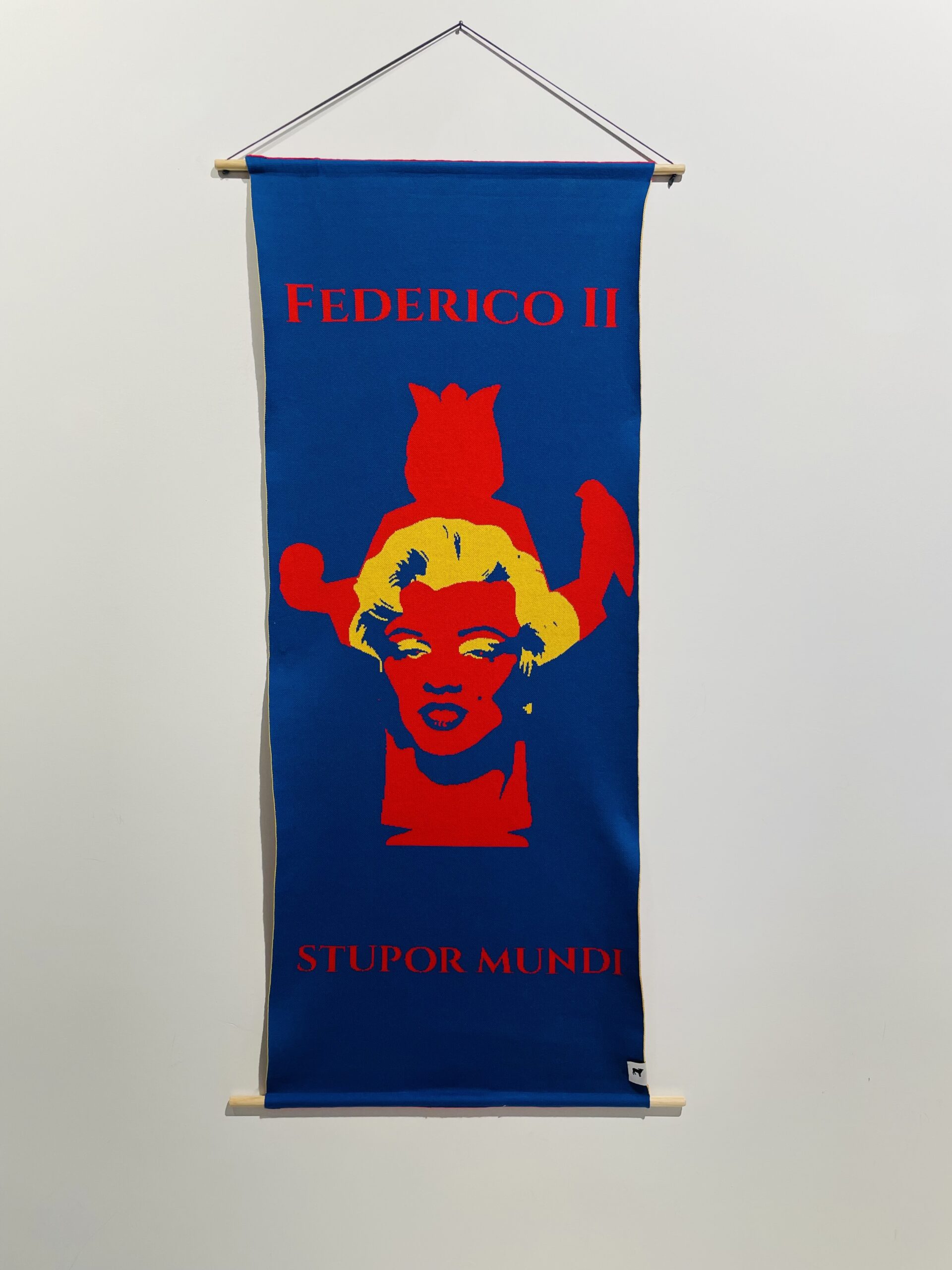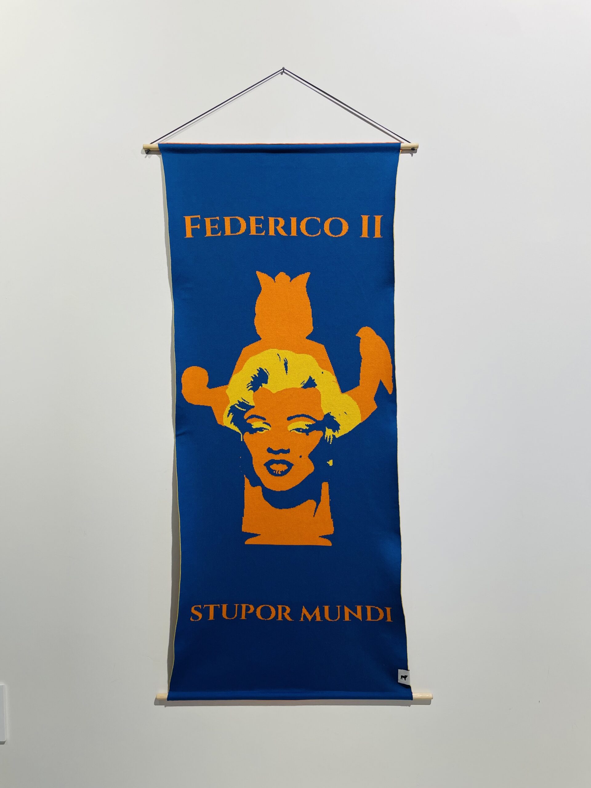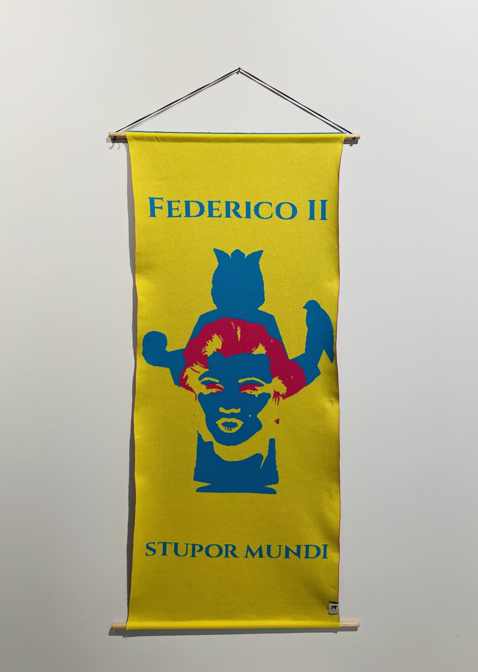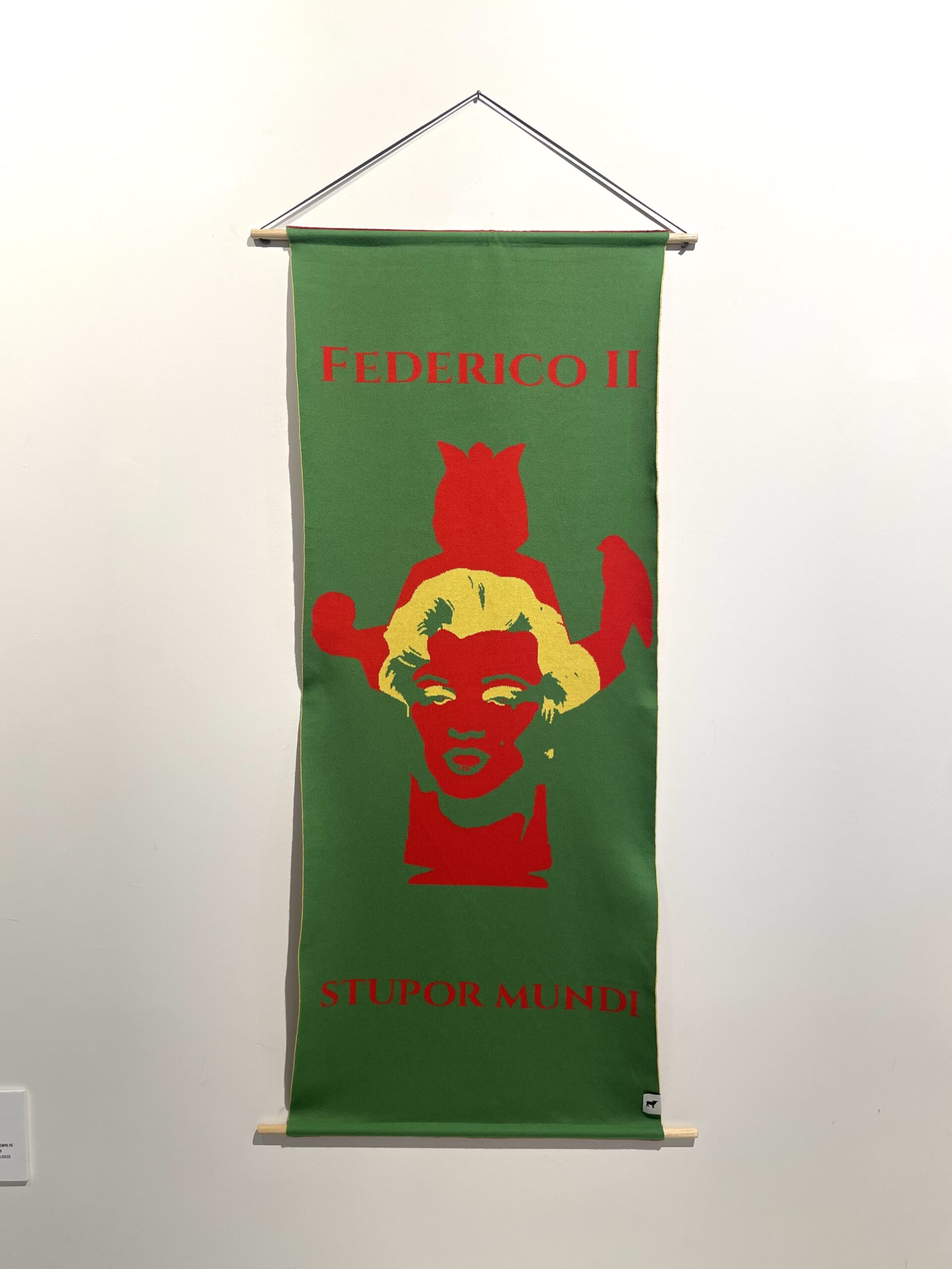 Un omaggio tessile alla figura visionaria di Federico II, reinterpretata da Massimo Melicchio. Lโarazzo รจ realizzato in cotone biologico in collaborazione con Lanificio Leo, storica realtร artigiana calabrese.