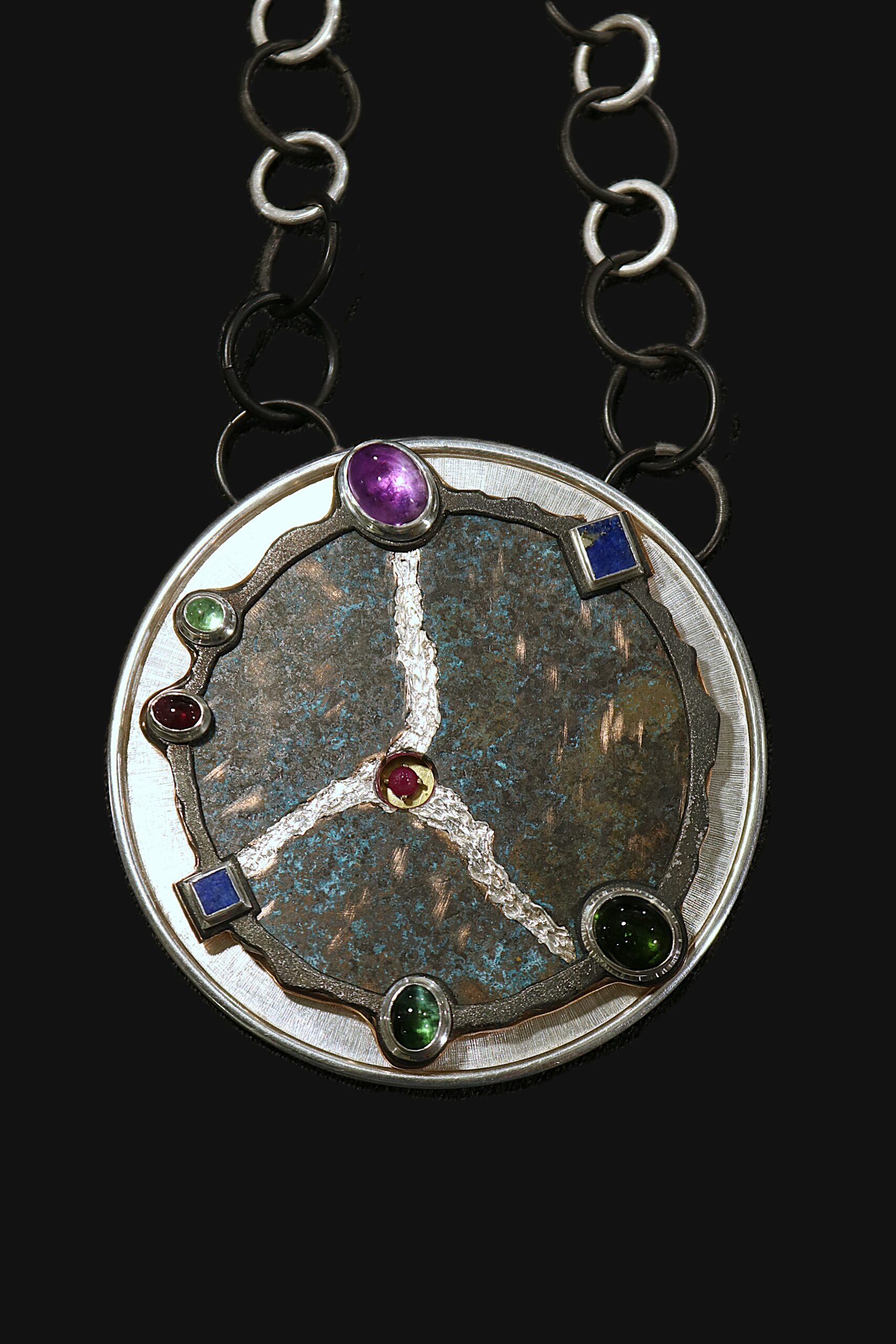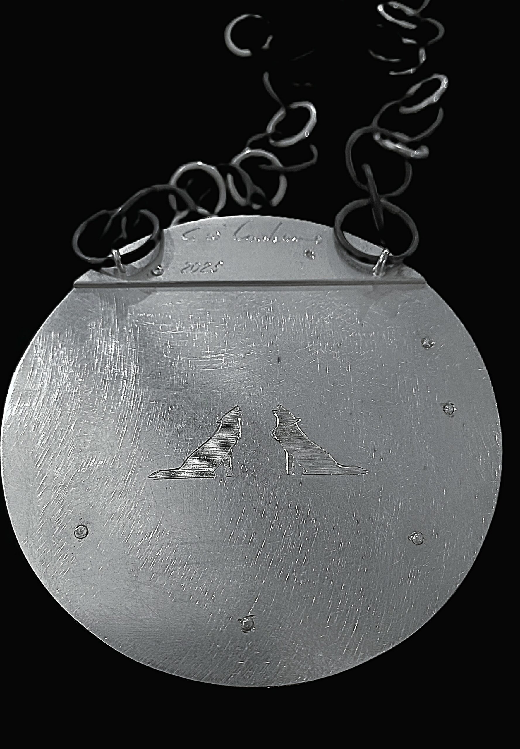 Il medaglione interpreta la confluenza dei fiumi e il mito del tesoro di Alarico attraverso una materia che diventa racconto: bronzo patinato come la memoria antica, argento puro a delineare i letti del Busento e del Crati, sette gemme lungo il perimetro, come le sette colline della città.